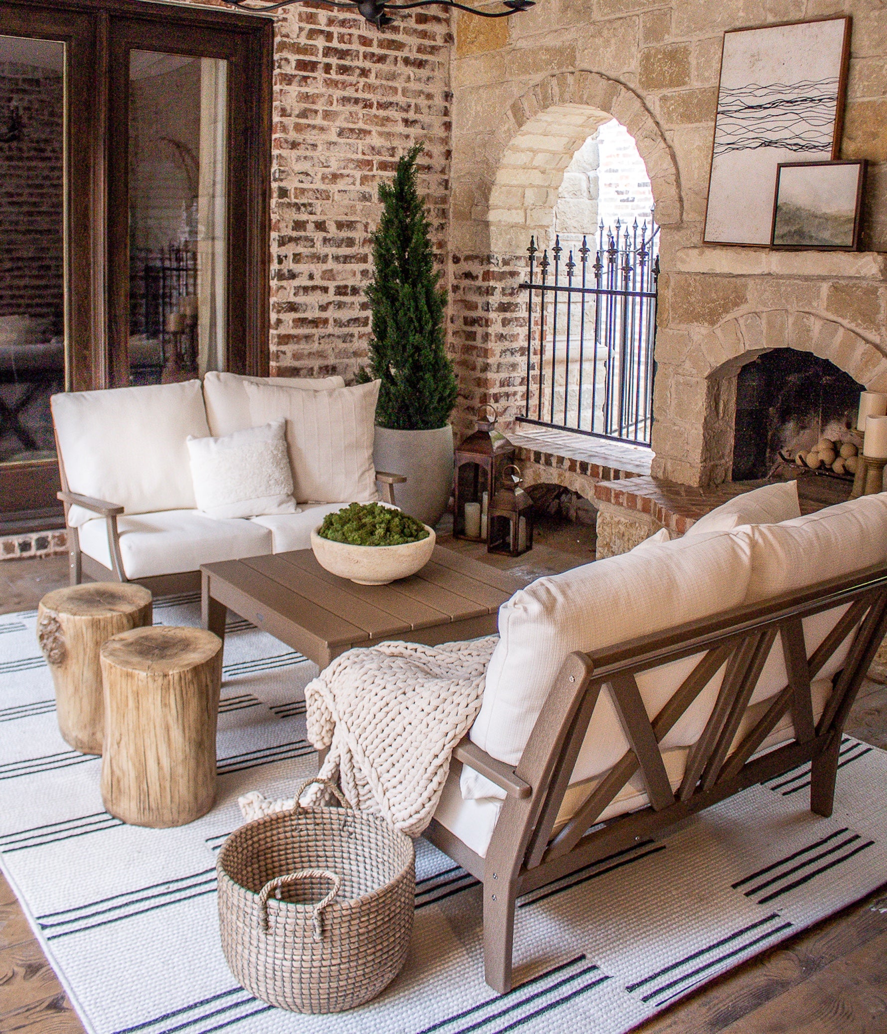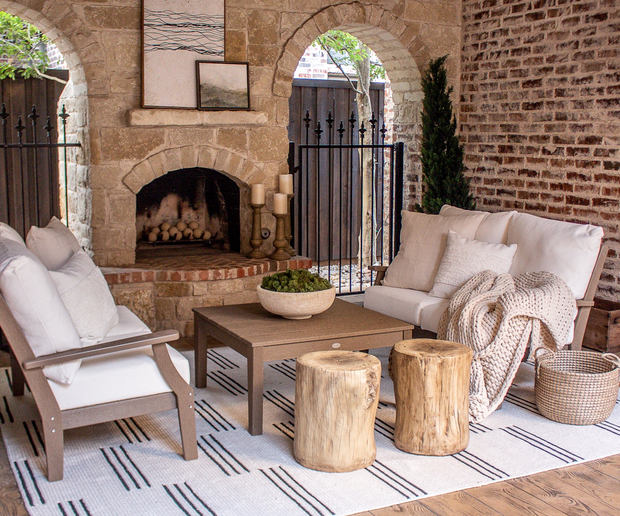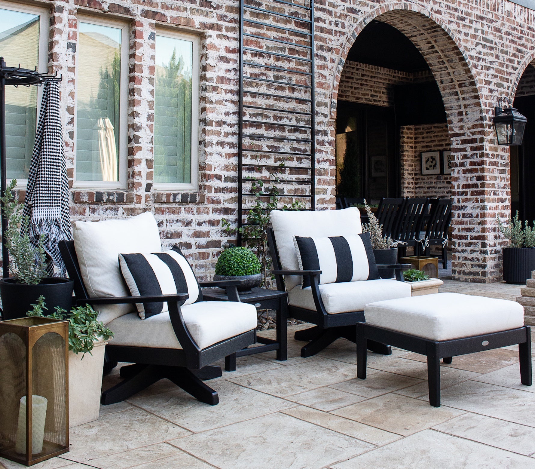 Keeping her outdoor layout in mind—as well as the Texas heat, humidity, and intense sun—Taryn used our Vineyard, Braxton, and Club Collections to bring her ideas to life. She took a warmer approach with the color scheme, blending brown hues into her beloved black-and-white palette. The neutral tones complemented the classic style while adding fresh modern vibes.