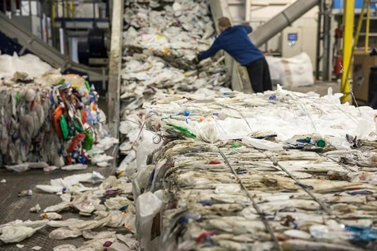 First, large bales of landfill- and ocean-bound plastics arrive at our recycling plant, flattened and bundled.