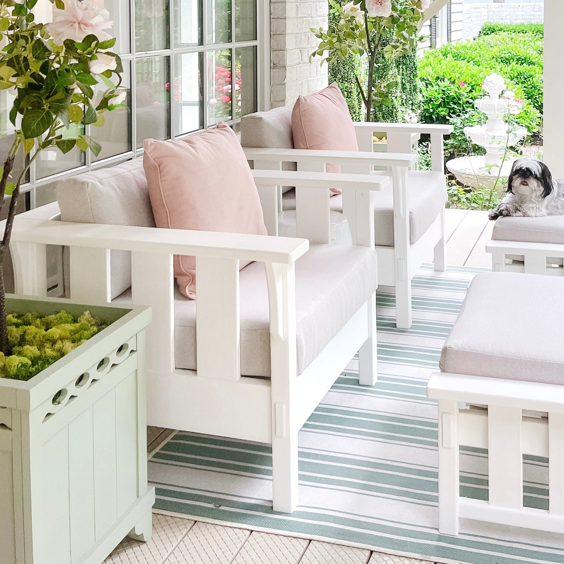 - Pillows, cushions, and umbrella canopies are sewn with outdoor performance fabric that resists moisture, salt, sun, mold, and mildew