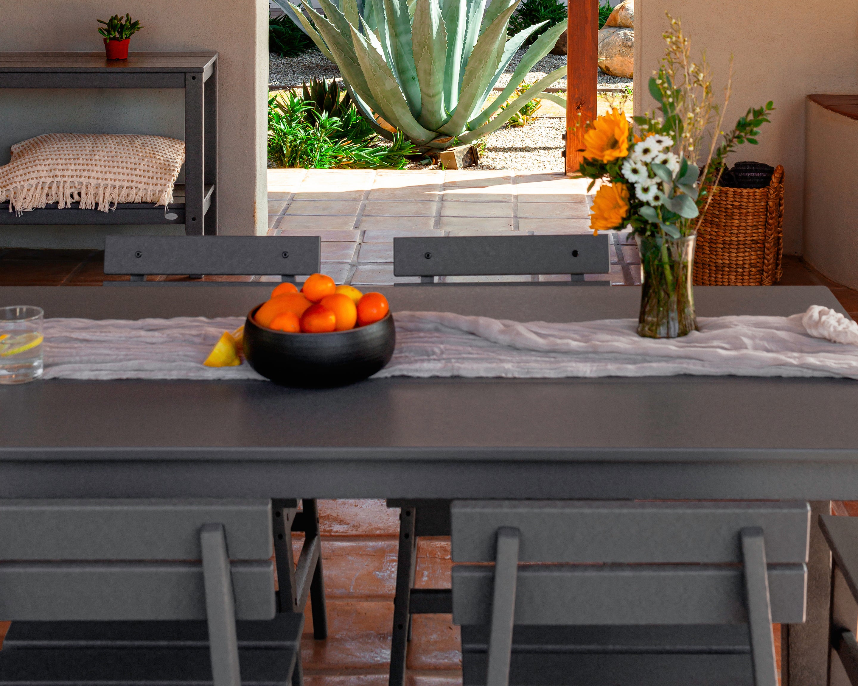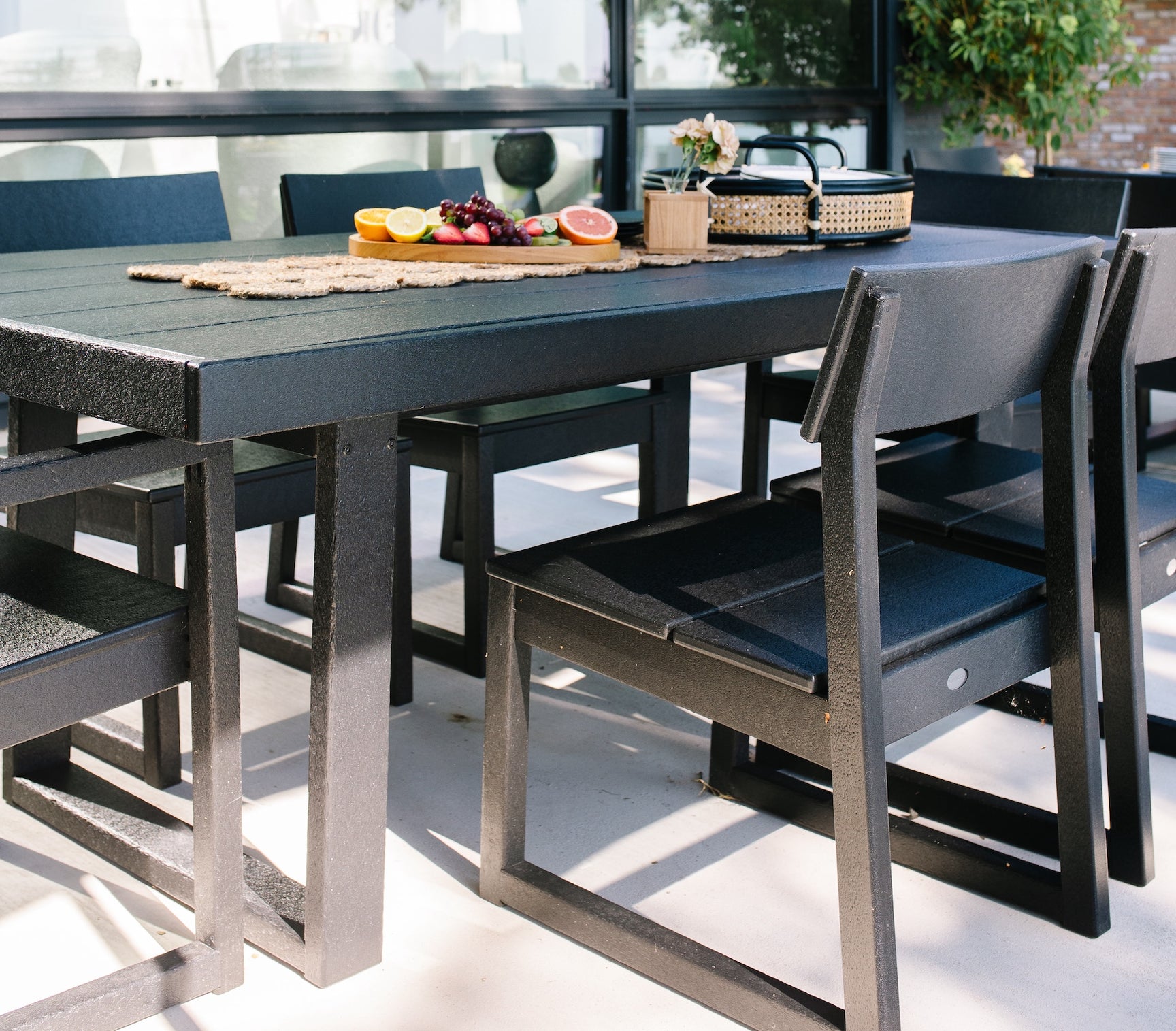 Our patio furniture will always look as good as new with very little effort. It doesn’t need to be covered or brought inside during inclement weather and cleans easily with soap and water.