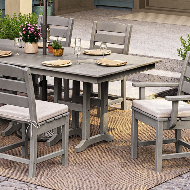 - Slatted tabletop features 1.625" umbrella hole and thin gaps for water drainage